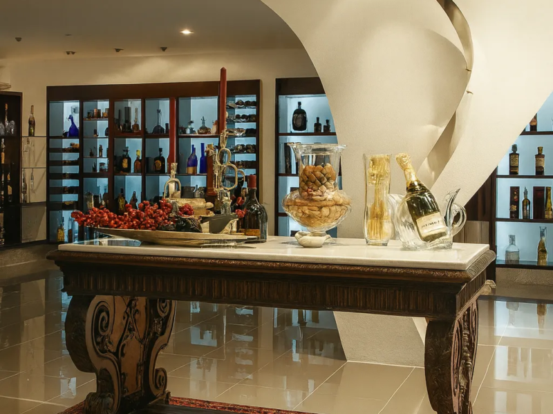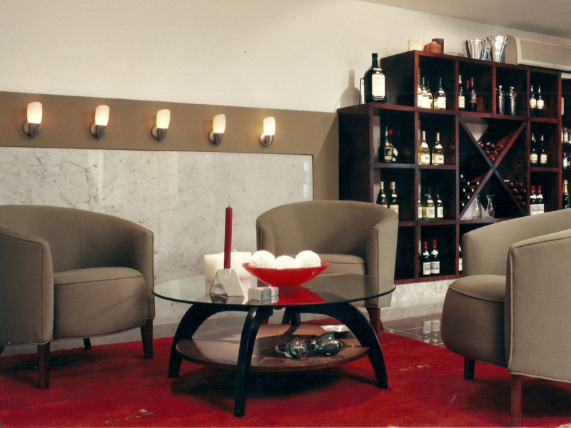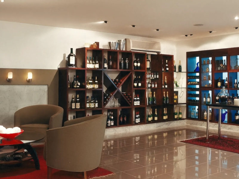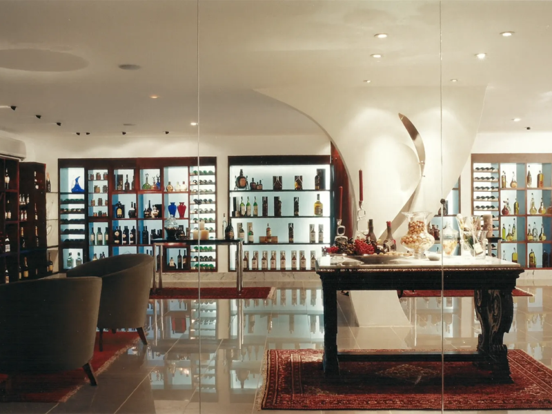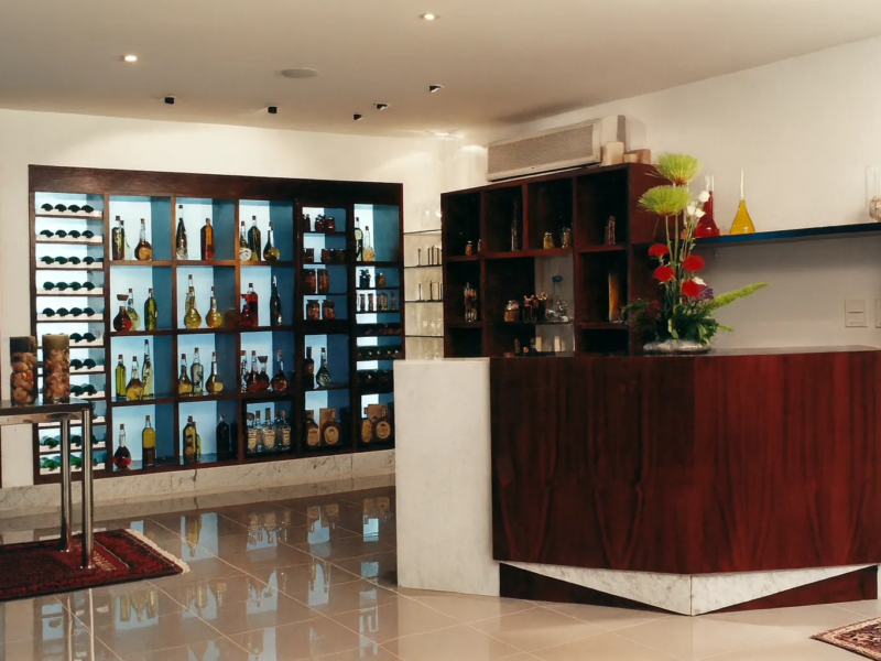 Silvana Borges uses an open space plan to provide an elegant wine tasting station and lounge area for customers to sit back and relax while they shop. The use of porcelain floors, mirrors, candles and beautiful dark oak wooden shelves are suitable for this design concept.